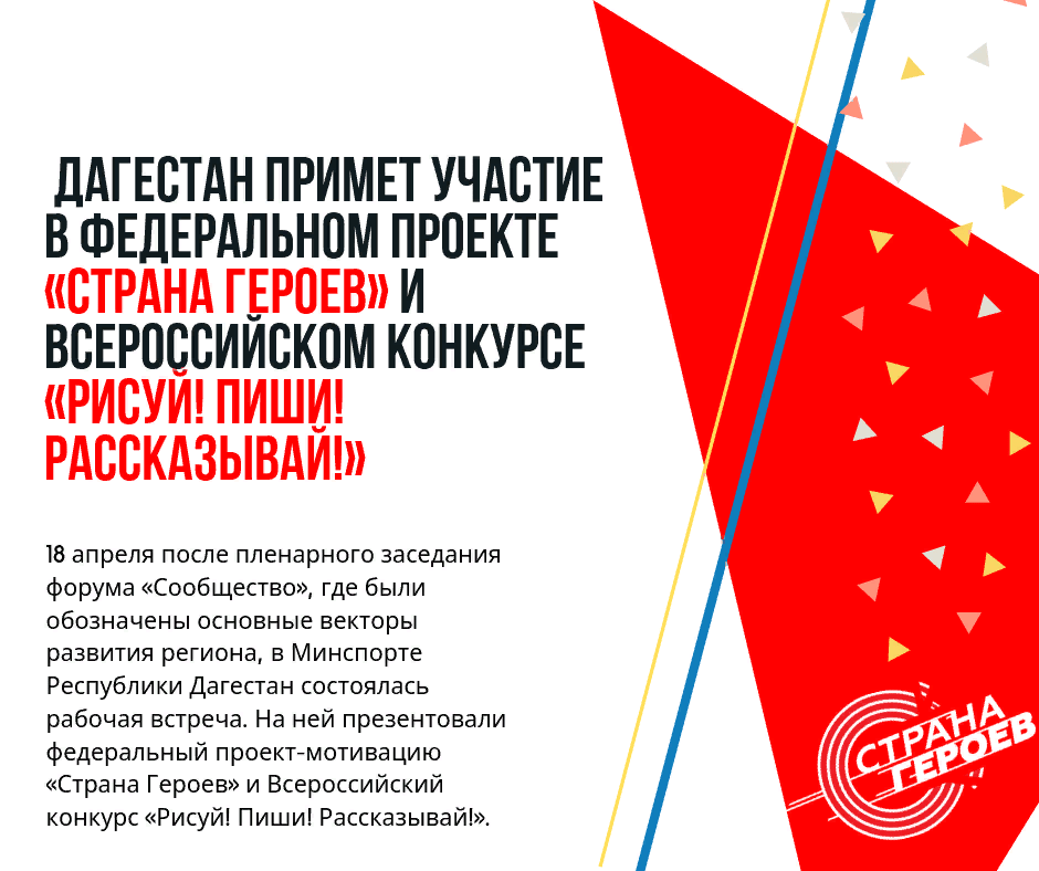 В Минспорте Республики Дагестана презентовали федеральный проект-мотивацию «Страна Героев» и Всероссийский конкурс «Рисуй! Пиши! Рассказывай!». О новых форматах агитации и пропаганды физической культуры и спорта рассказали главе Минспорта Республики Дагестан Магомеду Магомедову, первому заместителю министра Зайналу Салаутдинову, начальнику отдела профессионального образования и подготовки резерва Шамилю Нажмудинову и председателю Комитета по спорту, туризму и делам молодежи администрации города Махачкалы Марату Ибрагимову.
